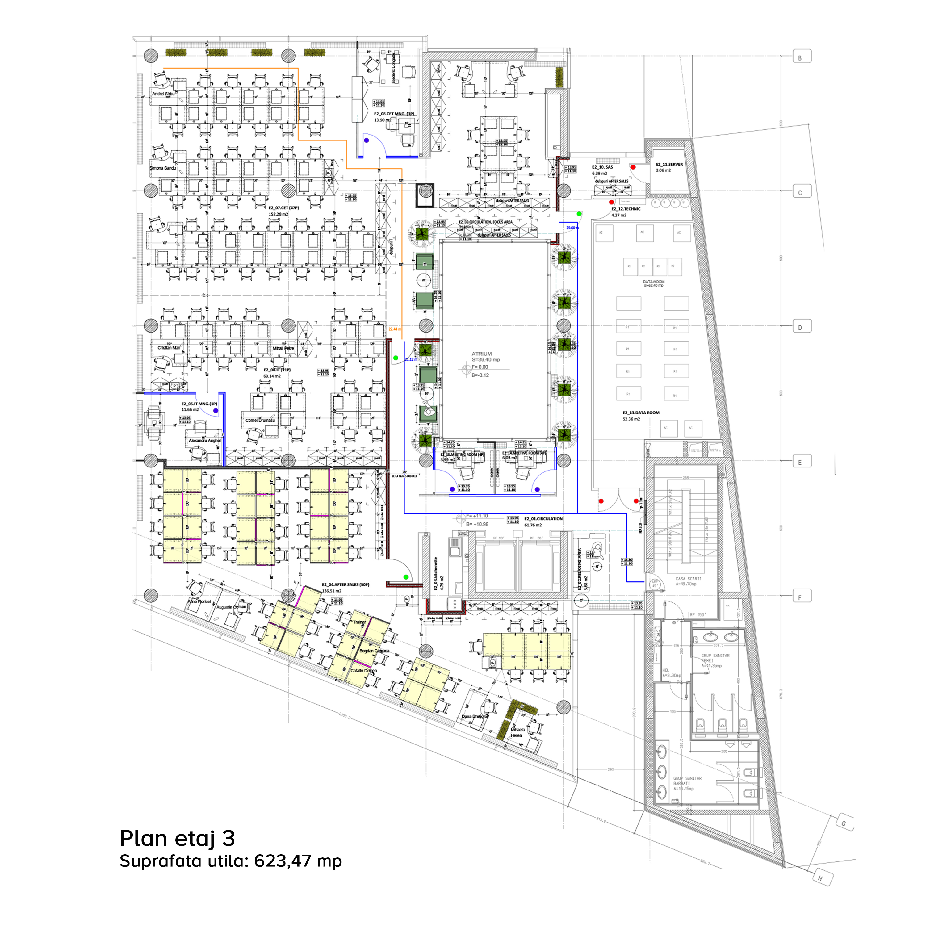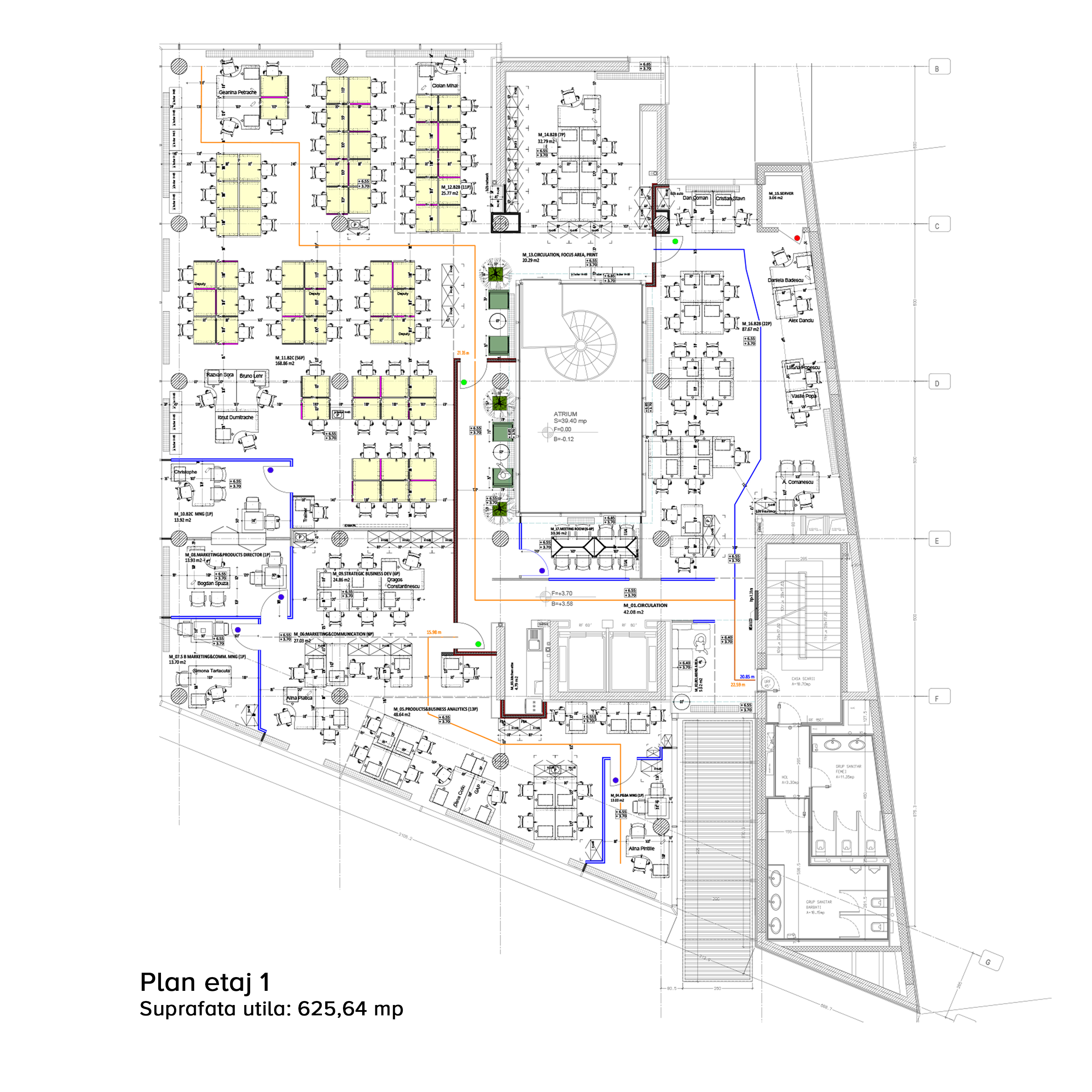 Pe planul propus s-au dispus doua volume/structuri diferite, o structura solida imaginara care gazduieste zona scarii si o structura contrastanta care contine zona de birouri, perforata de un patio (curte interioara) ce traverseaza vertical cladirea inchisa de un perete cortina.